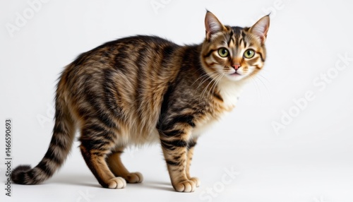 Playful tabby cat posing indoors studio photography bright white background animal portrait cute and curious expression