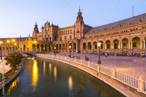 Plaza de Espana at dusk, built for the Ibero-American Exposition of 1929, Seville, Andalucia, Spain