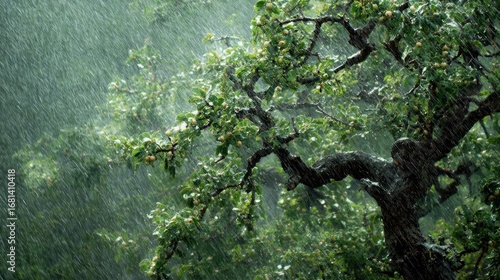 plum tree, storm, cloudburst, gale, windswept, drenched, turbulent, overcast, dramatic, motion, resilience, macro, dynamic, cinematic, moody, droplet, rainstorm, intensity