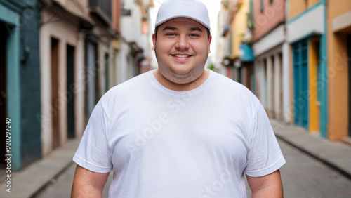 Plus size young man wearing white t-shirt and white baseball cap standing in a city alley