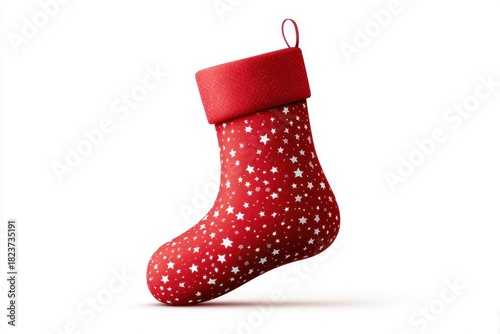 Plush Red Christmas Stocking with a Shimmering Star Pattern, Isolated on a Clean White Background.