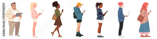casual clothes, illustration, transparent, collection, smartphone, technology, character, lifestyle, clothing, colourful, isolated, device, digital, diverse, element, casual attire, laptop, modern, people, tablet, group, mixed, phone, woman, man, set, use, diversity