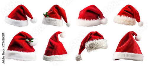 festive season, accessory, celebration, traditional, transparent, collection, decoration, christmas, realistic, cheerful, clothing, colourful, headwear, isolated, apparel, element, festive, holiday, fluffy, season, winter, claus, mixed, photo, santa, white, hat, red, set