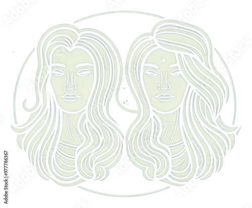 illustrated, drawing, vignetting, logotype, person, portrait, cartoon, circle, icon, line, art, woman, face, pattern, zodiac, adult, human, font, head, creativity, friendship, shape, white, blue, bonding, togetherness, closeup, transparent, young adult, copy space, coiffure, long hair, head shot, gemini, hair, representation, monochromatic, illustration, isolated, jacuzzi, smiling, blond, style, fine