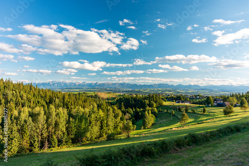 Podhale panorama - sunny rural landscape with rolling green hills, forest, farmhouses, and distant mountain range