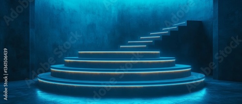 podium blue gradient background with glowing light effects and elegant circular platforms with gold light accents