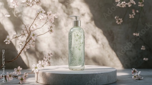 podium natural plant cosmetic mockup wellness products display. Elegant Bottle of Liquid Soap with Blossoms.