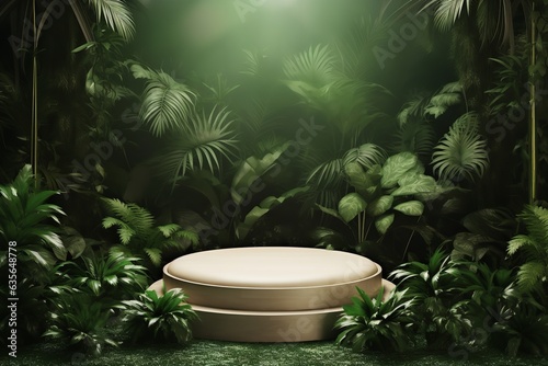 podium pedestal for product presentation on a tropical forest green ambience commercial mockup