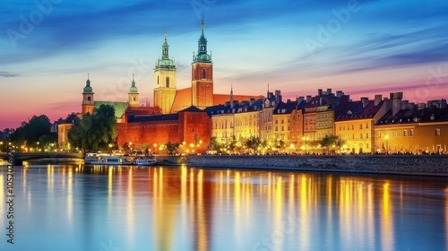 Poland's stunning nighttime cityscape of Warsaw, featuring the Palace of Culture.