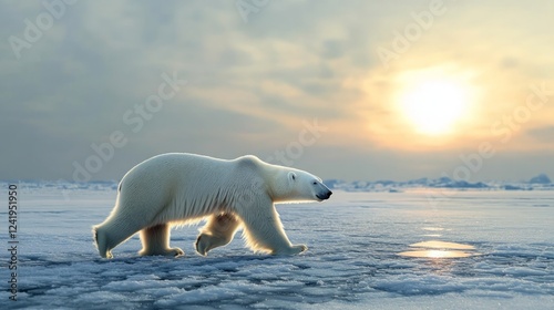 polar bear, ice, sunset, wildlife, nature, animal, arctic, landscape, cold, fur, solitary, habitat, snow, sea, environment, winter, glacé, adventure, beauty, tranquil, serene, mammal, walking, paw, sky, water, wilderness, climate, exploration, natural world, ecosystem, picturesque, sunlight, peaceful, coast, travel, remote, animal kingdom, motion, scenic view, frosty, chilly, majestic