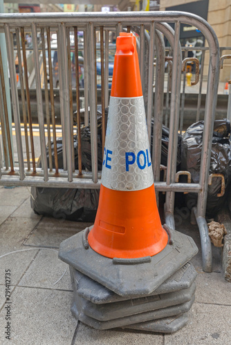 hong kong, asia, china, fence, metal, barrier, city, cone, cone, orange, pavement, plastic, police, signs, stack, stacked, street, traffic, traffic cone, day, equipment, transport