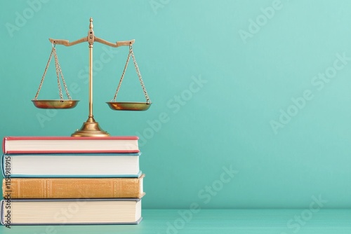 political crisis legislation concept. Balance scale on stacked books against a teal background.