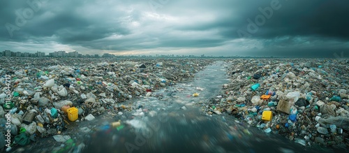 pollution, plastic, waste, environmental, contamination, garbage, trash, denied, rubbish, litter, junk, debris, disaster, crisis, problem, impact, damage, destruction, harm, threat, danger, risk, hazard, water, river, ocean, sea, landfill, dump, city, urban, sky, cloud, stormy, gloomy, dark, grey, panorama