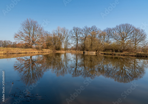 Pond with trees and sky reflection in early spring CHKO Poodri near Ostrava city in Czech republic