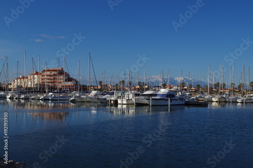 Port de plaisance sur fond de montagne
