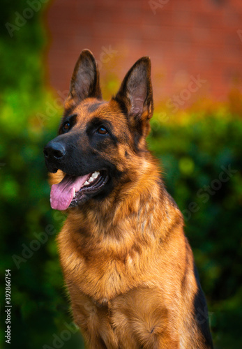 Portrait An obedient trained German Shepherd sits. Dog thoroughbred young female against a backdrop of green bushes and brick wall