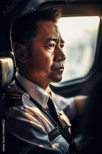Portrait Asian pilot, 45, confidently navigates the skies from the cockpit, skilled hands guiding the commercial aircraft, focused eyes, and experienced demeanor. Generative AI