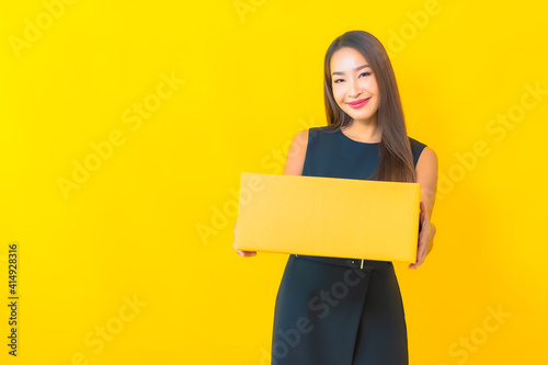 Portrait beautiful young asian business woman with brown box ready for shipping