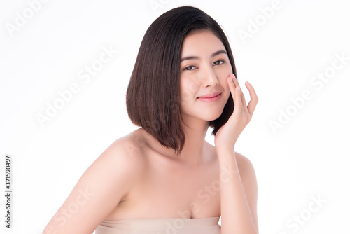 Portrait beautiful young asian woman clean fresh bare skin concept. Asian girl beauty face skincare and health wellness, Facial treatment, Perfect skin, Natural makeup, on white background,two