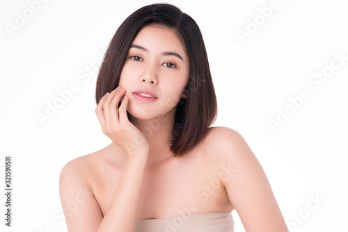 Portrait beautiful young asian woman clean fresh bare skin concept. Asian girl beauty face skincare and health wellness, Facial treatment, Perfect skin, Natural makeup, on white background,two