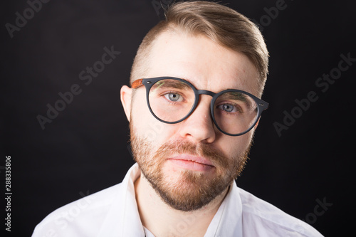 Portrait, guy and business people concept - Handsome man with glasses in white shirt looking at camera