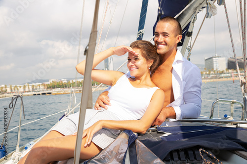 Portrait loving couple sailing on yacht in calm blue sea along Spanish coast during romantic trip