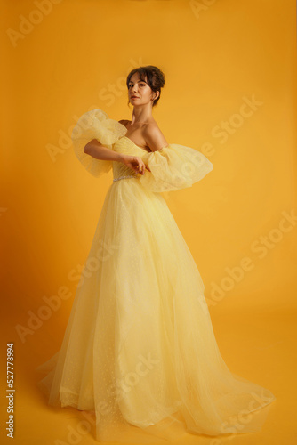 Portrait of a beautiful middle-aged woman in a yellow dress, her hair pulled up against a yellow background