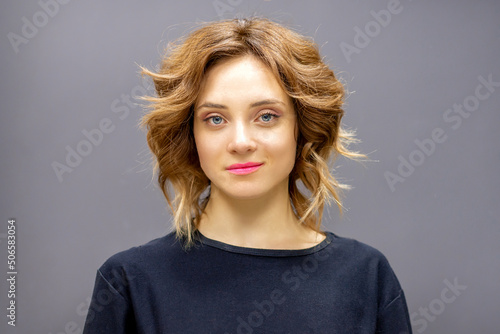 Portrait of a beautiful young caucasian red-haired woman with short wavy hairstyle smiling and looking at camera on dark gray background with copy space
