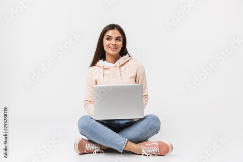 crossed, woman, young, student, university, caucasian, happy, isolated, learning, networking, laptop, youth, beautiful, computer, high, grey, modern, school, brunette, leg, casual attire, working, floor, female, communication, teenage, notebook, pretty, smiling, studying, attractive, web log, social, carefree, technology, girl, people, person, background, wireless, chatting, folded, sitting, cyberspace