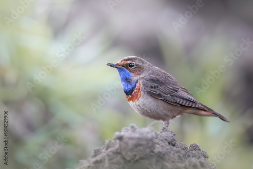 Portrait of a Bluethroat (Luscinia svecica) perched on a fench pole, Belgium
