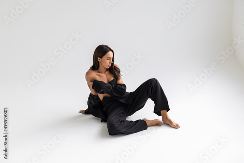 Portrait of a brunette woman in a black business suit and bra on the floor