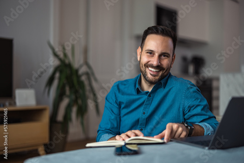 Portrait of a busy man, working over the laptop and holding a notebook, indoors.