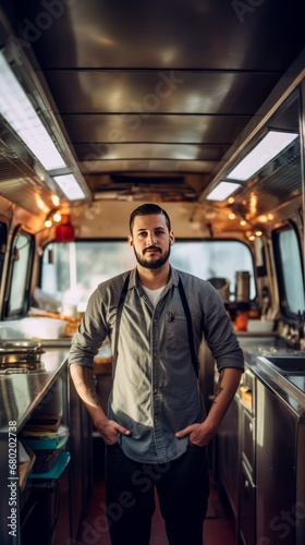 Portrait of a caucasian man cook seller of a street food truck, inside of food truck with crossed arms