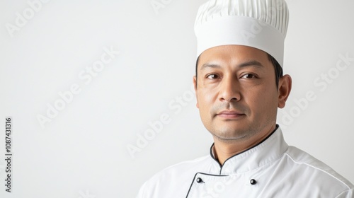Portrait of a chef, wearing a professional chef’s uniform and hat, minimal makeup, serious but confident expression, white background