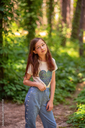 Portrait of a child. Teenage girl 11 years old in the forest.