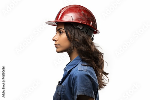 Portrait of a confident female construction worker wearing a hard hat and looking away, ready to take on any challenge at the construction site with determination and professionalism. Isolated on the