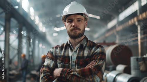 Portrait of a confident worker in a factory wearing hard hat with business people in background