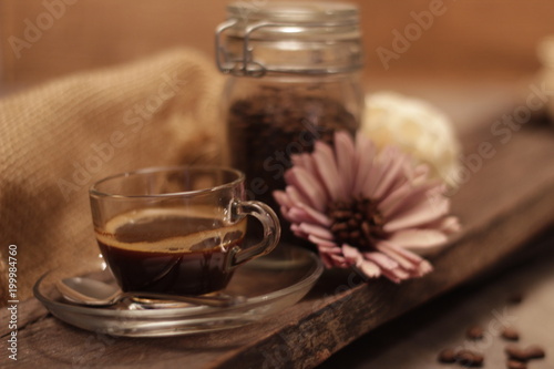 Portrait of a cup of coffee on a wooden board, with a flower and a container of coffee beans. Concept: Relax, breakfast, love