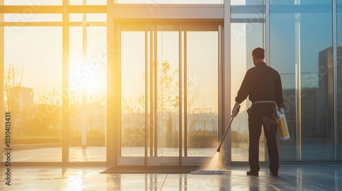 Portrait of a glass cleaner washing large glass doors of an office building during sunrise photo