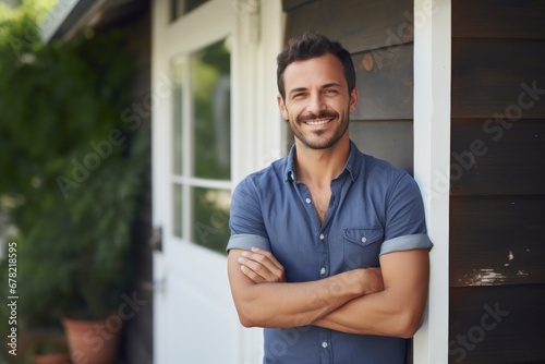 Portrait of a grinning man in his 30s wearing a simple cotton shirt against a stylized simple home office background. AI Generation