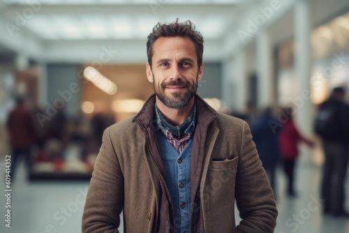 Portrait of a handsome bearded man in coat at the shopping center