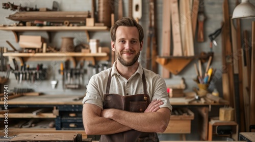 portrait of A handsome young carpenter wearing an apron standing in his workshop with arms crossed, and looking at the camera with a smile, copy space for text banner.