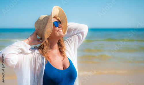 Portrait Of A Happy And Smiling Mature Woman With Perfect White Smile On The Beach