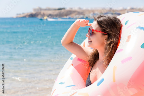Portrait of a happy girl looking through inflatable ring stay on the sea beach. Summer holidays and vacation concept