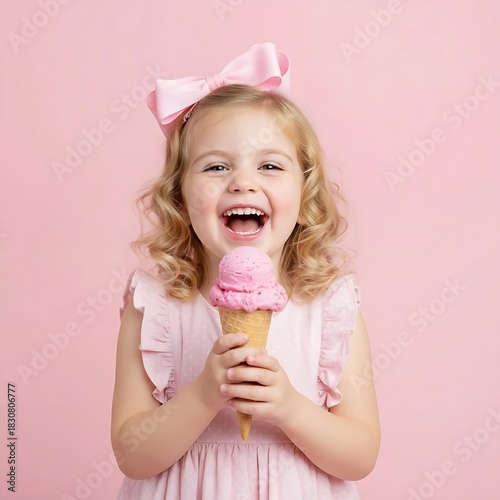 portrait, little, girl, children, toddler, children, children, childhood, face, people, person, happy, smiling, character, holding, ice cream, ice, cream, pink, strawberry, food, sweet, dessert, snack, delicious, epicure, frost, freeze, eating, cold, cone, summer, object, isolated, white, light, fashion, modern, model, image, picture, photo, wallpaper, background, design, style, art, creative