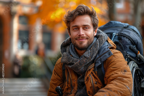 Portrait of a happy man in wheelchair with physical disability in the university,generative ai