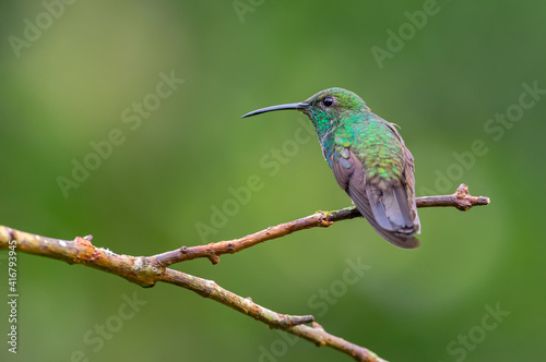 Portrait of a hummingbird from behind while looking curiously from a branch
