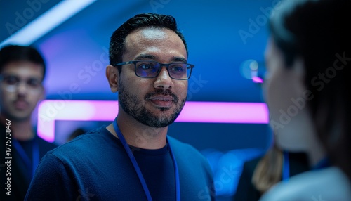 man, goggles, conversation, conference, event, smiling, networking, engagement, discussion, male, face, modern, tech, industry, digital, communication, professional, adult, serious, smart, focused, listening, talking, idea, expression, interaction, cooperation, colleague, teamwork, together, positive, friendly, approachable, intelligent, knowledgeable, expert, speaker, presenter, participant, delegate, workshop, training, seminar, meeting, forum, convention, gathering