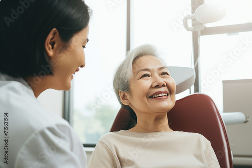 Portrait of a mature lady smiling in the dentists office generative AI image