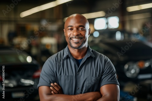 portrait, middle, aged, african american, male, mechanic, car, shop, people, man, men at work, garage, repair, vehicle, automotive, service, maintenance, occupation, work, uniform, tool, engineer, technician, industry, expertise, professional, job, adult, fixing, transportation, machinery, engine, manual, skill, experienced, happy, labor, indoor, daylight, technology, equipment, business, auto, lifestyle, copy space